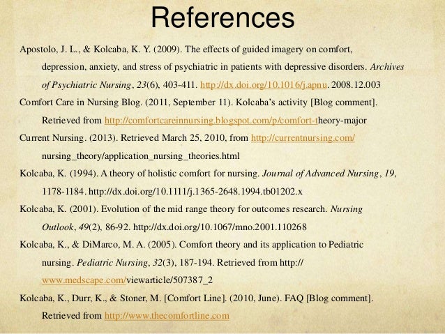 & McCormack, D. (2009). Nursing theory directed healthcare Comfort theory and practice: a vision for holistic health care and research. New York, NY 10012-3955: Springer Publishing Co., Inc. Kolcaba, K., & DiMarco, M. (2005). Comfort theory and its application to pediatric nursing ... Retrieve Content